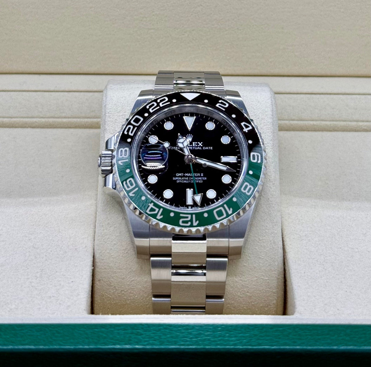 発表当初から高い注目を集め、現在も正規店での入手が極めて困難な“スプライト”ベゼルのGMTマスターII。デザイン性と実用性を兼ね備えた一本を、この機会にぜひご検討ください。
