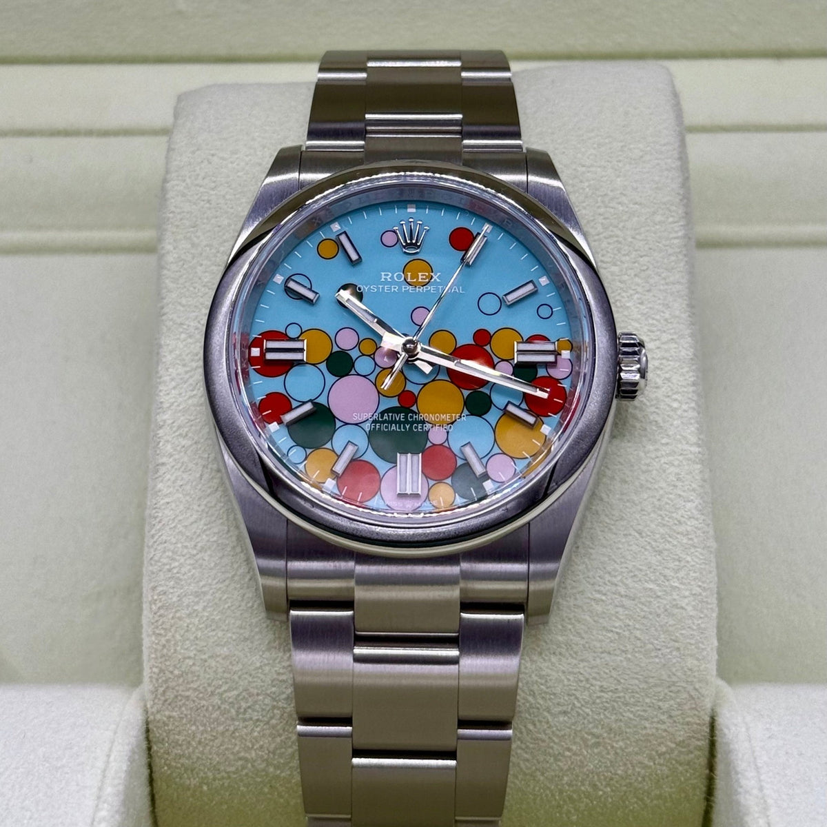 市場での希少性は上がり続けており、41mmの廃盤に続く可能性もある36mmのオイスターパーペチュアルセレブレーションモチーフダイアルはコレクターズアイテムとしての価値が高いです。